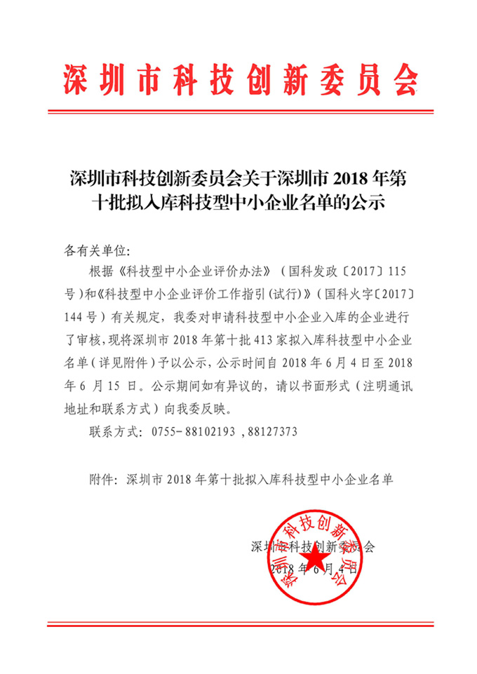 經(jīng)廣東省政府主管部門,深圳市科技創(chuàng)新委員會(huì),深圳市福田區(qū)科創(chuàng)局的一致肯定,成功入庫(kù)“科技創(chuàng)新型企業(yè)”名單。