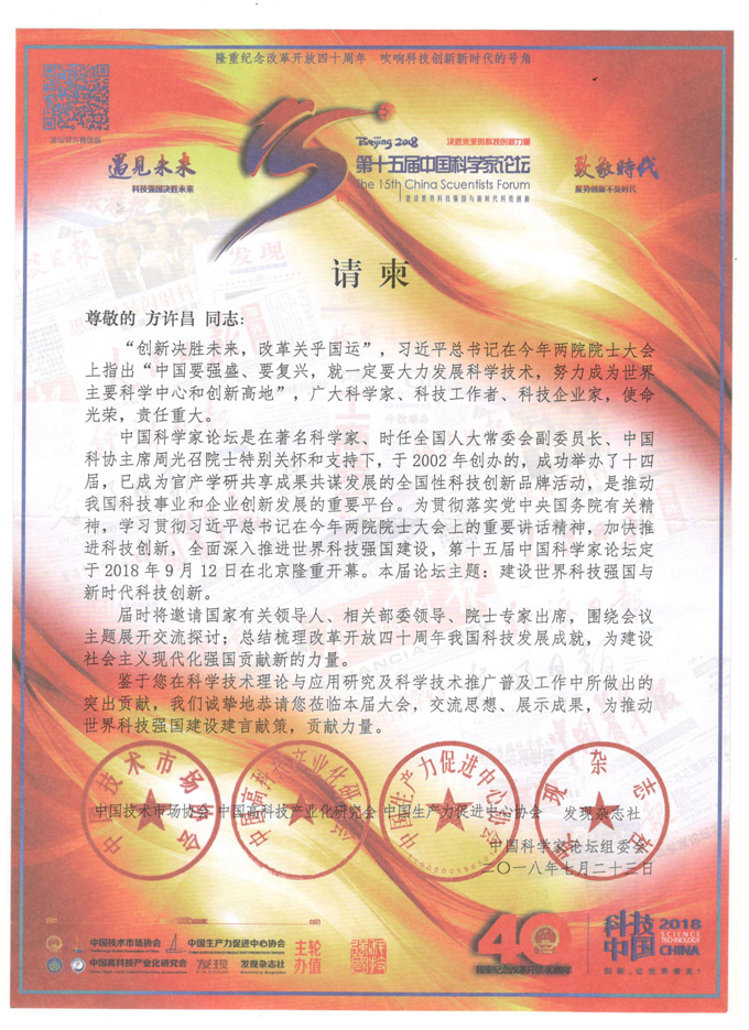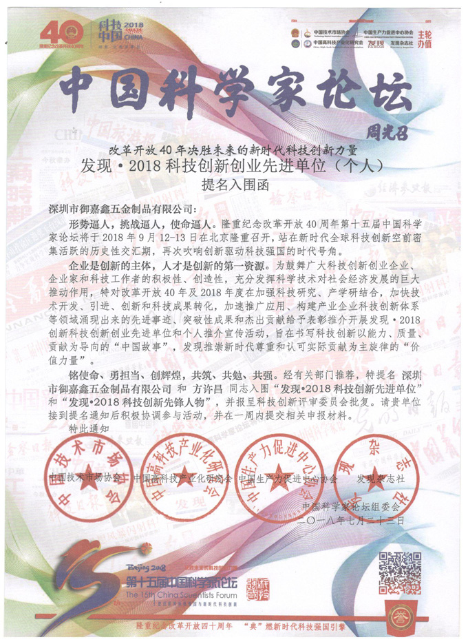 隆重紀念改革開放40周年第十五屆中國科學(xué)家論壇將于2018年9月12-13號在北京隆重召開,深圳市御嘉鑫五金制品有限公司董事長、總經(jīng)理方許昌先生,也將受邀參加此次中國科學(xué)家論壇!同各界人士一道,交流思想、展示成果,積極為中國科學(xué)創(chuàng)新事業(yè)的發(fā)展貢獻出自己的力量。