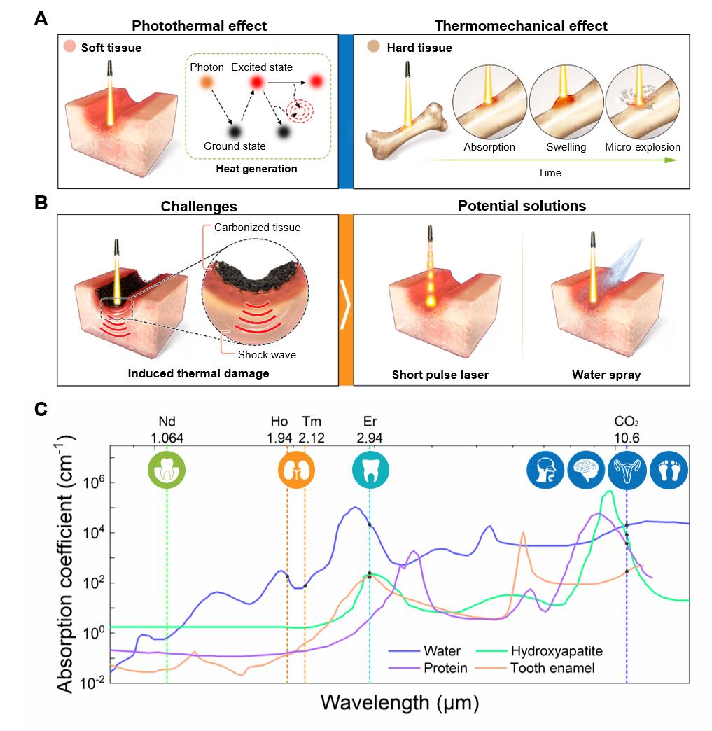 與基于機械加工的傳統(tǒng)手術工具不同,激光手術刀通過獨特的組織光學作用實現(xiàn)高效生物組織加工。文章詳細闡述了針對軟組織與硬組織切除的光熱消融與光致機械消融機理,并討論了水介導和超短脈沖激光技術在緩解組織凝結(jié)、碳化等熱損傷方面的研究進展(圖1)。進一步地,文章分析了以Nd、Ho、Tm、Er和CO2激光為主的紅外醫(yī)療光源在牙科、泌尿外科等多種手術領域的特點、優(yōu)勢與應用價值,并強調(diào)新型手術激光光源技術的進步給激光傳輸介質(zhì)在靈活性、穩(wěn)定性和操控性等方面帶來的巨大挑戰(zhàn)。