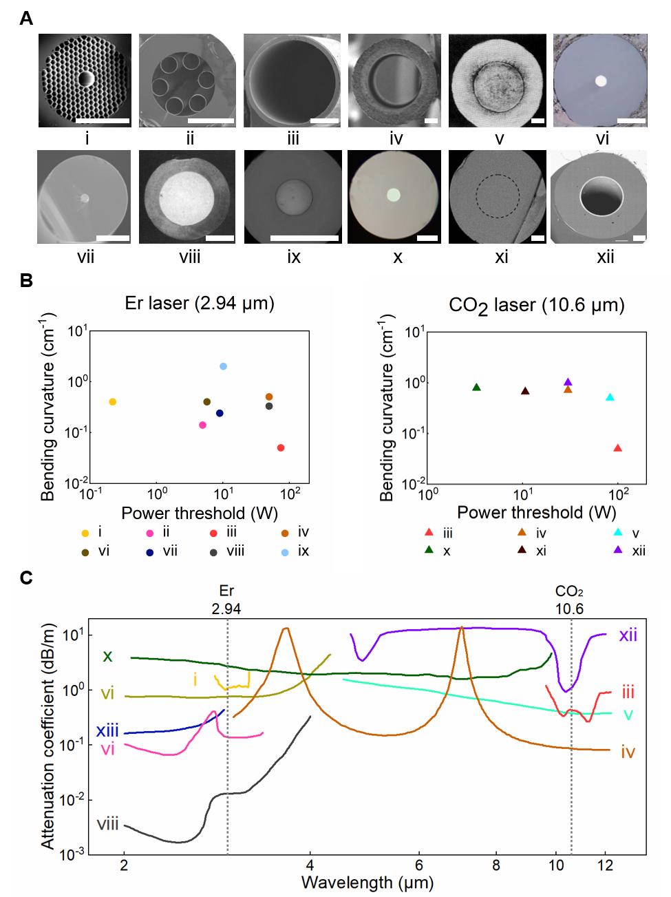 激光傳輸介質(zhì)作為激光手術刀系統(tǒng)中的關鍵器件,需要穩(wěn)定地將激光能量遞送至特定手術部位。文章系統(tǒng)闡述了導光臂、空心波導和紅外光纖三類主要醫(yī)用激光傳輸介質(zhì)的研究現(xiàn)狀,并強調(diào)小尺度、高靈活性的紅外光纖器件在微創(chuàng)外科醫(yī)療中的應用潛力。文章全面分析了紅外光纖器件的研究進展,從激光傳輸閾值、光學損耗和機械柔性角度比較了光纖在Er激光和CO2激光中的器件性能(圖2),并指出高光學損耗和低機械強度是限制紅外光纖器件在外科手術中深度應用的關鍵因素。近年來多材料纖維技術的快速發(fā)展,不同光、力、電、磁等物理性能的復合材料高度一體化集成,為開發(fā)高柔性低損耗中紅外光纖并進一步提升手術器械功能性提供了可靠研究支撐。