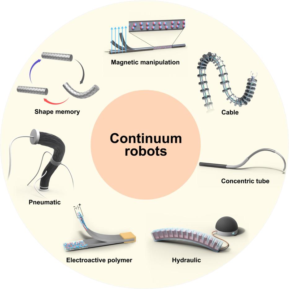 手術器械的精準操控是實現(xiàn)高效微創(chuàng)手術的重要因素。材料科學與生物工程學科的快速發(fā)展,催生了驅(qū)動方式多樣的連續(xù)體手術機器人研究,促進了精準外科醫(yī)療發(fā)展。文章全面分析了現(xiàn)有連續(xù)體機器人的驅(qū)動機理與特性(圖3),指出基于磁驅(qū)動方式的連續(xù)體機器人在安全、精準和智能化外科手術介入中的巨大潛力。此外,文章進一步提出了柔性纖維機器人激光手術刀的概念,激光手術刀與醫(yī)療連續(xù)體機器人的結(jié)合推動了其更為廣泛的臨床應用,這些系統(tǒng)已成功應用于泌尿外科、婦科和耳鼻喉科手術。